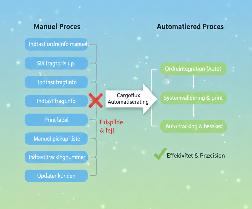 Ved høj volumen er det ikke kun minutterne. Det er også robustheden. Når en proces er afhængig af manuelle steps, bliver den sårbar, når noget ændrer sig. Flere transportører, flere variationer, flere hasteopgaver.
